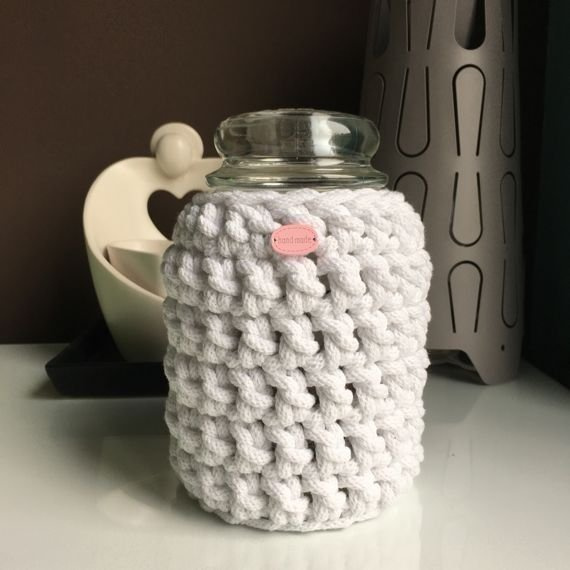Osłonka na świecę zapachową ze sznurka bawełnianego wykonana na szydełku. Poza tym, że wygląda pięknie i stylowo, ułatwia rozgrzanie świecy do ścianek.
