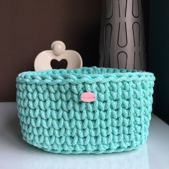 Ręcznie robiony Koszyk ze sznurka bawełnianego mięta 600 dno 20x20, wysokość 12 cm