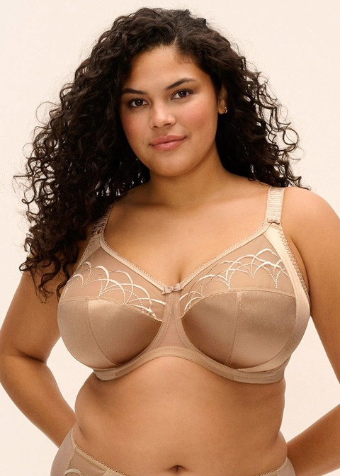 Call the shots with confidence in Cate. A real Elomi classic, this collection in a Hazel colourway offers incomparable comfort and support all day long. Featuring a semi-sheer embroidered top cup with a chic intersecting arc design. Grosgrain textured straps and a looped neck edge trim completes the look.