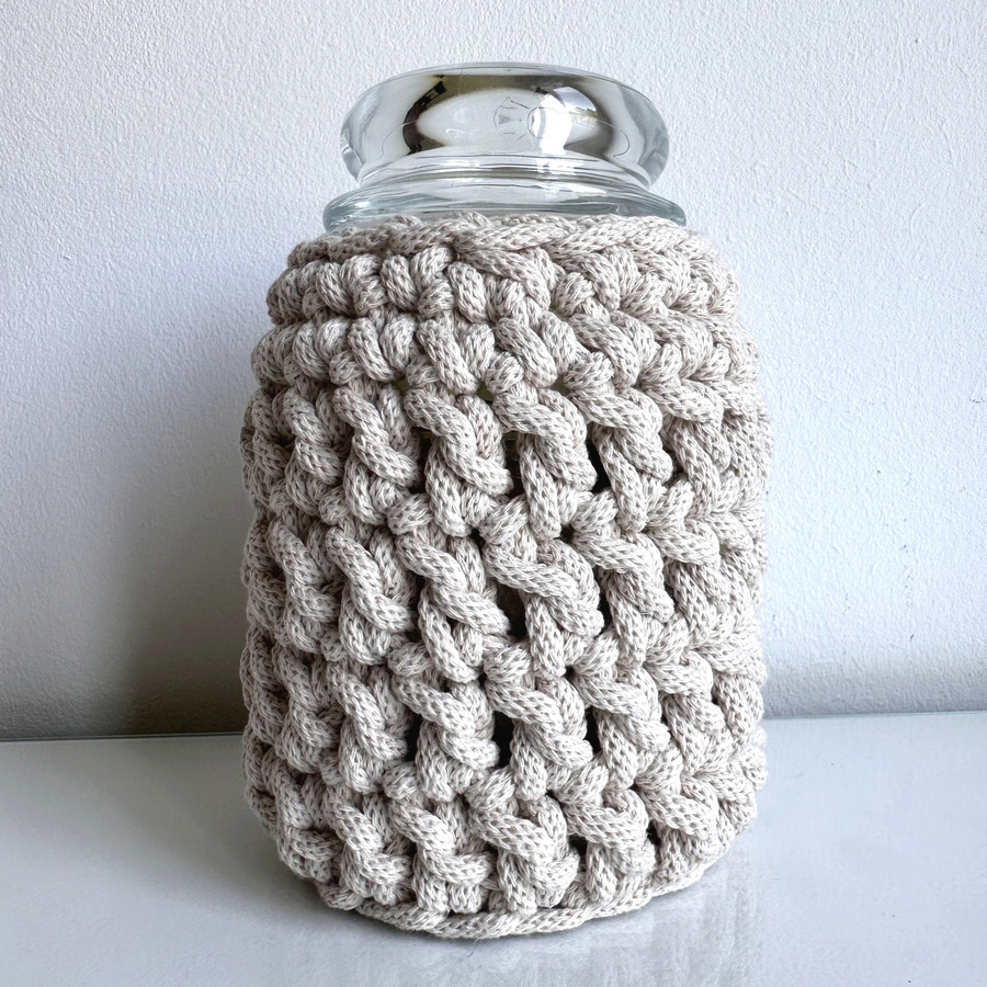 Osłonka na świecę zapachową ze sznurka bawełnianego wykonana na szydełku. Poza tym, że wygląda pięknie i stylowo, ułatwia rozgrzanie świecy do ścianek.