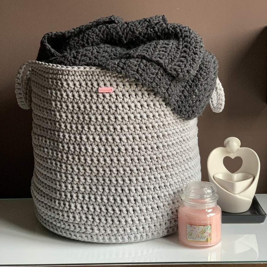 Duży kosz ze sznurka bawełnianego wykonany na szydełku. Jest idealny na koce, zabawki. Pozwala utrzymać porządek w salonie, w sypialni i w dziecięcym pokoju.