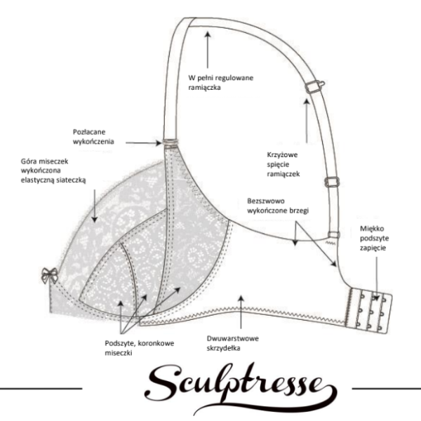 W pełni regulowane, dekoracyjne ramiączka z możliwością spięcia na plecach. Finalne dopasowanie bielizny do różnych potrzeb sylwetki. Krzyżowe spięcie to dodatkowa stabilizacja i zebranie biustu.